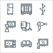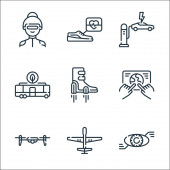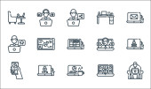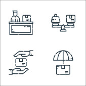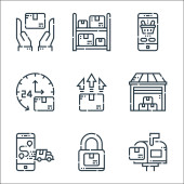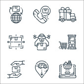 Ikony linii dostawy. zestaw liniowy. wysokiej jakości zestaw linii wektorowych, takich jak prezent, e-mail, ubezpieczenie, bańka czatu, smartfon, dostawa, samolot, ręce