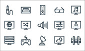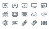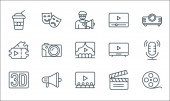 ikony linii kina. zestaw liniowy. wysokiej jakości zestaw linii wektorowych, takich jak dźwięk, migawka, nagroda, aparat fotograficzny, film, vhs, scenariusz, komedia, soda