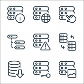ikony linii serwerów biurowych. zestaw liniowy. zestaw linii wektorowych jakości, takich jak moc, udostępnianie danych, eksport, udostępnianie, podłączenie, tworzenie sieci, strona internetowa, dane, kod binarny