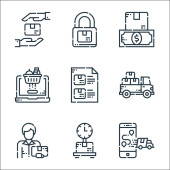 Ikony linii dostawy. zestaw liniowy. zestaw linii wektorowych jakości, takich jak czas dostawy, dostawa dronów, kalendarz, sposób płatności, medycyna, samochód ciężarowy, śledzenie, żywność