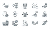 ikony linii koronawirusów. zestaw liniowy. wysokiej jakości zestaw linii wektorowych, takich jak bat, zagrożenie biologiczne, wirus, świnia, mycie rąk, trudności w oddychaniu, zagrożenie biologiczne, google bezpieczeństwa