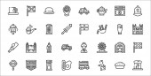 ikony linii cyrkowej. zestaw liniowy. wysokiej jakości zestaw linii wektorowych, takich jak mikrofon, cel, muszka, teatr, hantle, ludzka kula armatnia, cel, frytki, pierścień ognia