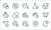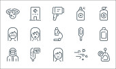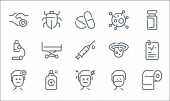 ikony linii przesyłu wirusa. zestaw liniowy. wysokiej jakości zestaw linii wektorowych, takich jak ból głowy, ręka, ręka, poręcz, płytka Petriego, człowiek, termometr, wirus, język się