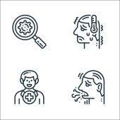 ikony linii przesyłu wirusa. zestaw liniowy. wysokiej jakości zestaw linii wektorowych, takich jak kobieta, probówka, uścisk dłoni, zawroty głowy, świnia, zawroty głowy, kaszel, nietoperz