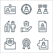ikony linii zasobów ludzkich. zestaw liniowy. wysokiej jakości zestaw linii wektorowych, takich jak, cel, puzzle, oferta pracy, rekrutacja, decyzja, godziny pracy, wynagrodzenie