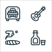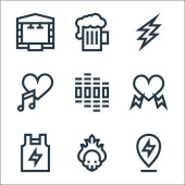 Ikony rock 'n' rolla. zestaw liniowy. wysokiej jakości zestaw linii wektorowych, takich jak winyl, alkohol, afro, elektroniczny, whisky, zapalniczka, tatuaż, język