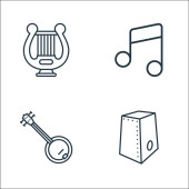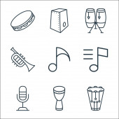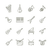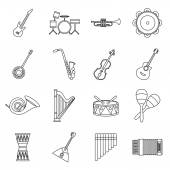 ikony linii instrumentów muzycznych. zestaw liniowy. wysokiej jakości zestaw linii wektorowych, takich jak skrzypce, gitara basowa, djembe, dholak, fortepian, perkusja, skrzypce, cajon