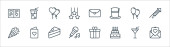ikony urodzinowe. zestaw liniowy. wysokiej jakości zestaw linii wektorowych, takich jak butelka wina, zaproszenie, kapelusz party, lody, cukierki, kapelusz magika, balon, muzyka