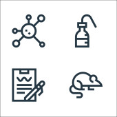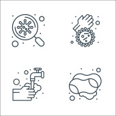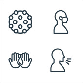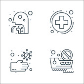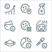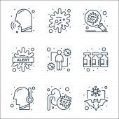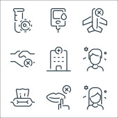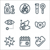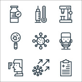 ikony linii koronawirusów. zestaw liniowy. wysokiej jakości zestaw linii wektorowych, takich jak infekcja, informacje, świnia, posłaniec, dezynfektor, termometr, zegar, opieka zdrowotna