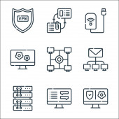 ikony linii telekomunikacyjnych. zestaw liniowy. zestaw linii wektorowych jakości, takich jak telekomunikacja, konfiguracja, vpn, udostępnianie, kamera internetowa, e-mail, telekomunikacja, spotkanie
