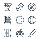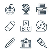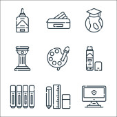 ikony linii edukacyjnej. zestaw liniowy. wysokiej jakości zestaw linii wektorowych, takich jak plecak, książka, tablica, książka, pisanie, stół, szkoła, linijka krzywej, książki