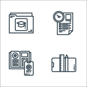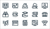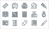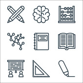 ikony linii edukacyjnej. zestaw liniowy. wysokiej jakości zestaw linii wektorowych, takich jak linijka, półka na książki, książki, otwarta książka, tablica, książka, dyplom, książka