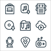ikony komunikacji i linii mediów. zestaw liniowy. wysokiej jakości zestaw linii wektorowych, takich jak słuchawki, odtwarzacz muzyczny, laptop, vhs, godziny, pobierz, aparat fotograficzny, ząb