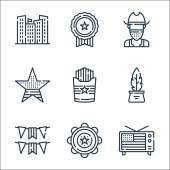 ikony z lipca. zestaw liniowy. wysokiej jakości zestaw linii wektorowych, takich jak księżyc, kawa, biały dom, usa, budynek, medal, kiełbasa, spodenki