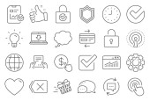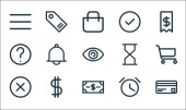 ikony e-commerce starter pack. zestaw liniowy. zestaw linii wektorowych jakości, takich jak źle, połączenie telefoniczne, pasek narzędzi, menu, monety, bezpieczne, dzwonek, czek, dodaj do koszyka