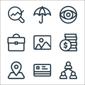 ikony linii biznesowych. zestaw liniowy. zestaw linii wektorowych jakości, takich jak filiżanka, stos monet, lista kontrolna, klucz, strategia, id card, cit card, parasol
