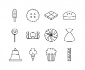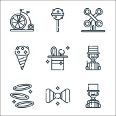 ikony linii cyrkowej. zestaw liniowy. wysokiej jakości zestaw linii wektorowych, takich jak mistrz ceremonii, wata cukrowa, popcorn, pochodnia, armata, dekoracja, zasłona, lizak
