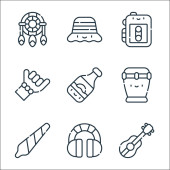 ikony linii reggae. zestaw liniowy. wysokiej jakości zestaw linii wektorowych, takich jak piwo, joint, hamak, djembe, Jamajka, słuchawki, bonga, wiadro