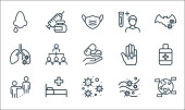 ikony linii zdrowia i ochrony. zestaw liniowy. wysokiej jakości zestaw linii wektorowych, takich jak mycie rąk, opieka zdrowotna, ubrania, pielęgniarki, maski, buty, zdrowa żywność, oko, krew