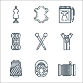 ikony linii szycia. zestaw liniowy. wysokiej jakości zestaw linii wektorowych, takich jak fartuch, skóra, manekin, katalog, szkic, spódnica, wzór, sukienka
