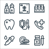 ikony linii medycyny. zestaw liniowy. wysokiej jakości zestaw linii wektorowych, takich jak bandaż, książka medyczna, szpital, kropla krwi, złamana noga, tabletki, ząb, zaprawa, schowek