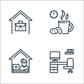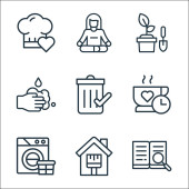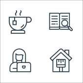 Zdjęcie "Zostań w ikonach domowej linii. zestaw liniowy. wysokiej jakości zestaw linii wektorowych, takich jak słuchanie, sprzątanie, praca, czas kawy, pisać, czytać, malować, zdrowe" może być wykorzystywane do celów osobistych i komercyjnych zgodnie z warunkami zakupionej licencji Royalty-free. Obraz jest dostępny do pobrania w jakości wysokiej rozdzielczości do 5760x3840.