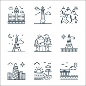 ikony linii turystycznych. zestaw liniowy. wysokiej jakości zestaw linii wektorowych, takich jak stacja, dwupokładowy autobus, centrum handlowe, wieża Eiffla, balon na gorące powietrze, statek wycieczkowy, basen, wschód słońca