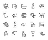 ikony linii koronawirusów. zestaw liniowy. wysokiej jakości zestaw linii wektorowych, takich jak dezynfektor rąk, dotyk, uścisk dłoni, dezynfektor rąk, papier toaletowy, bakteriologia, hazmat, rękawiczki, pranie