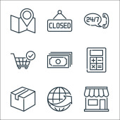 ikony linii e-commerce. zestaw liniowy. zestaw linii wektorowych jakości, takich jak karty ciche, globalna sieć, lista kontrolna, portfel, obsługa klienta, magazyny, narzędzie matematyczne, etykieta, etykieta
