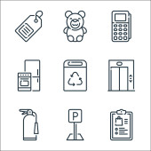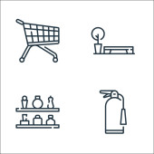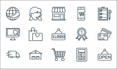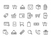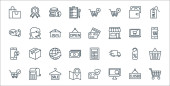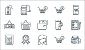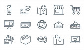 ikony linii e-commerce. zestaw liniowy. zestaw linii wektorowych jakości, takich jak pieniądze, monety dolarowe, portfel, zakupy online, koszyk zakupów, koszyk zakupów, paragon, etykieta rabatowa, pudełko kartonowe