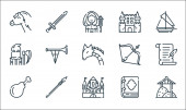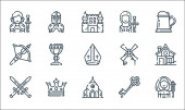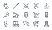 ikony linii czasów średniowiecza. zestaw liniowy. wysokiej jakości zestaw linii wektorowych, takich jak hełm, zbroja, błazen, heraldyczny, kubek piwa, lanca, koń, maczuga
