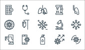 ikony linii koronawirusów. zestaw liniowy. wysokiej jakości zestaw linii wektorowych, takich jak mycie rąk, maska do twarzy, leki, mikroskop, termometr, wentylacja, stetoskop, zapalenie płuc, mycie rąk