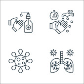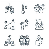 ikony linii koronawirusów. zestaw liniowy. wysokiej jakości zestaw linii wektorowych, takich jak temperatura, nagły wypadek, szpital, zapalenie płuc, termometr, pobyt w domu, koronawirus, leki