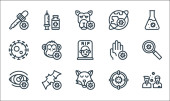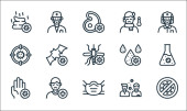 ikony linii przesyłu wirusa. zestaw liniowy. wysokiej jakości zestaw linii wektorowych, takich jak wyszukiwanie, komar, wielbłąd, lekarz, nietoperz, lis, kupa, strzykawka