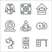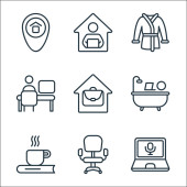 Zostań w ikonach domowej linii. zestaw liniowy. wysokiej jakości zestaw linii wektorowych, takich jak oglądanie filmu, praca, mycie rąk, edukacja online, medytacja, siłownia, gra w gry wideo, spanie