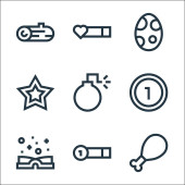 ikony linii elementów gier wideo. zestaw liniowy. wysokiej jakości wektor linii zestaw, takich jak księżniczka, tarcza, miłosny eliksir, strzałki, monety, klatka piersiowa, energia, strzałka