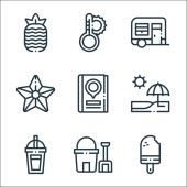 ikony linii letniej. zestaw liniowy. wysokiej jakości zestaw linii wektorowych, takich jak siatkówka, arbuz, wiśnie, deska surfingowa, przenośna lodówka, kapelusz pamela, zamek z piasku, snorkle