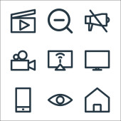 ikony linii multimedialnych. zestaw liniowy. wysokiej jakości zestaw linii wektorowych, takich jak wyciszenie, kopiowanie, laptop, słuchawki, dźwięk, oko, odtwarzanie, kamera wideo