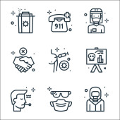 ikony linii pandemii płaskiego wirusa covid. zestaw liniowy. wysokiej jakości zestaw linii wektorowych, takich jak mężczyzna, odległość, mycie rąk, ekran komputera, kobieta, uścisk dłoni, starszy, kaszel