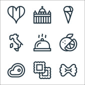 ikony parku rozrywki. zestaw liniowy. wysokiej jakości zestaw linii wektorowych, takich jak tarcza, balony, zamek, zderzaki łodzi, lizak, hamburger, bullseye, girlandy