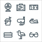 ikony linii letniej. zestaw liniowy. wysokiej jakości zestaw linii wektorowych, takich jak surfing, koszulka, napój kokosowy, maska nurkowa, dmuchany basen, arbuz, rozgwiazdy,