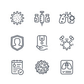 ikony linii koronawirusów. zestaw liniowy. zestaw linii wektorowych jakości, takich jak recepta, zakażony, wyszukiwanie wirusów