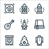 Meksykańskie ikony linii. zestaw liniowy. wysokiej jakości zestaw linii wektorowych, takich jak zampona, dalia, dywan, sukienka, tacos, tradycyjne, świeca, ajolote