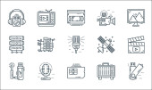 ikony linii urządzeń technologicznych. zestaw liniowy. wysokiej jakości zestaw linii wektorowych, takich jak kamera wideo, telefon, poziom baterii, mikrofon, maszyna do szycia, karta sim, przedłużacz, budzik, ekspres do kawy
