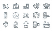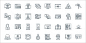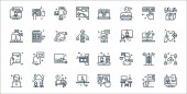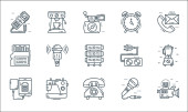 ikony linii urządzeń technologicznych. zestaw liniowy. wysokiej jakości zestaw linii wektorowych, takich jak baran, poziom baterii, robot, kuchenka ciśnieniowa, pralka, mikrofon, aplikacja medyczna, projektor, rolka filmu