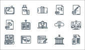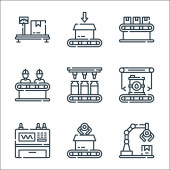 ikony linii masowej produkcji. zestaw liniowy. zestaw linii wektorowych jakości, takich jak pakiet, pieniądze, ramię robota, pudełko, maszyny, rozpakowanie, pracownik, pojemnik, opakowania
