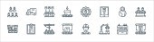 ikony linii masowej produkcji. zestaw liniowy. wysokiej jakości zestaw linii wektorowych, takich jak opakowania, kod kreskowy, opakowanie, dźwig, babeczki, opakowania, pilot zdalnego sterowania, pracownicy