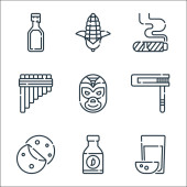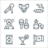 Meksykańskie ikony linii. zestaw liniowy. wysokiej jakości zestaw linii wektorowych, takich jak szalik, czaszka, krzyż, wapno, kukurydza, bęben, marakasy, piwo, słońce