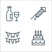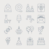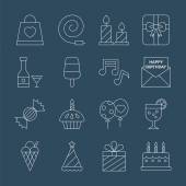 ikony urodzinowe. zestaw liniowy. wysokiej jakości zestaw linii wektorowych, takich jak zaproszenie, ciasto, zaproszenie, tosty, balon, tort urodzinowy, kapelusz magika, świeca