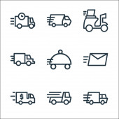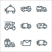 ikony linii pojazdów. zestaw liniowy. wysokiej jakości zestaw linii wektorowych, takich jak ciężarówka kontenerowa, ciężarówka, autobus elektryczny